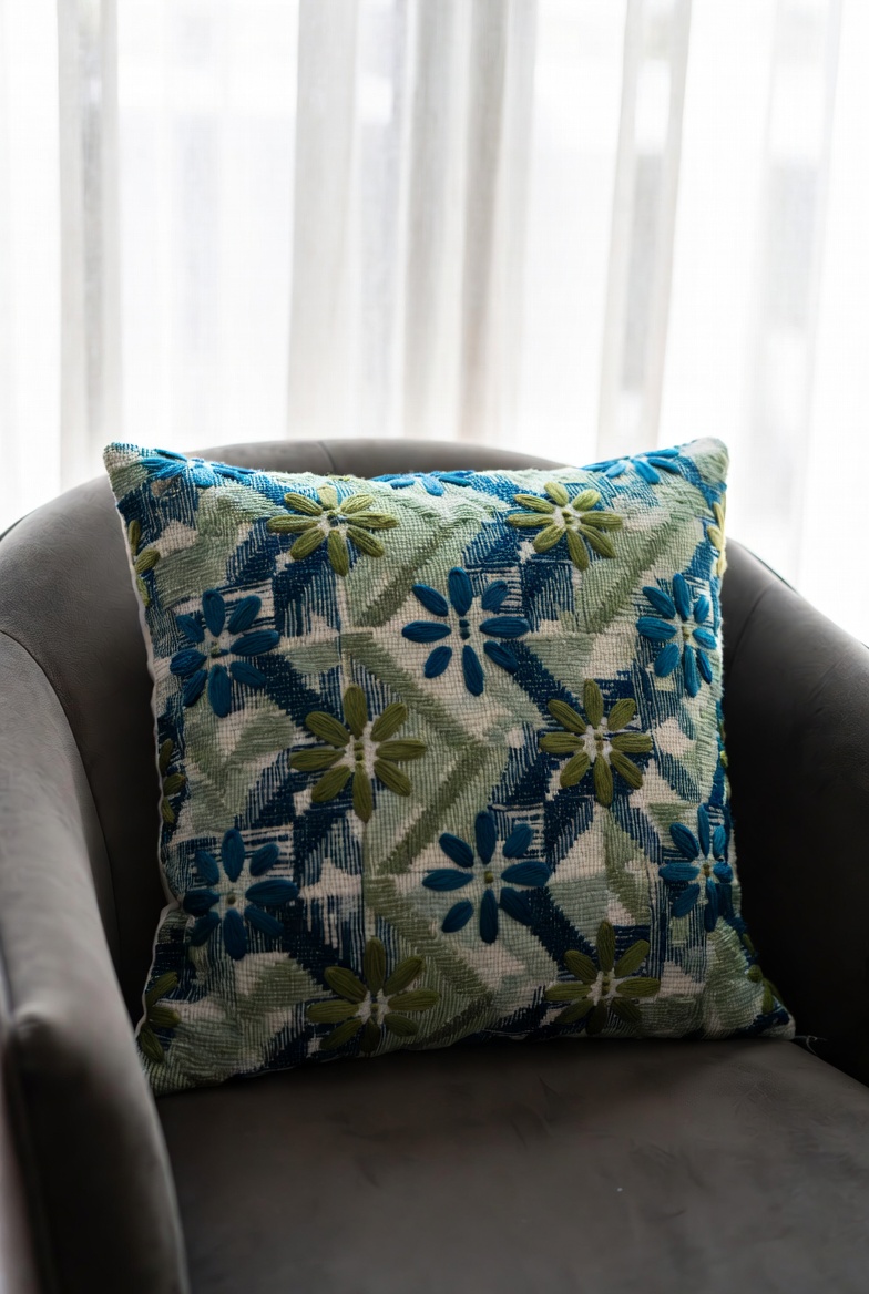 Motifs: Woven geometric foundation with hand-embroidered floral accents