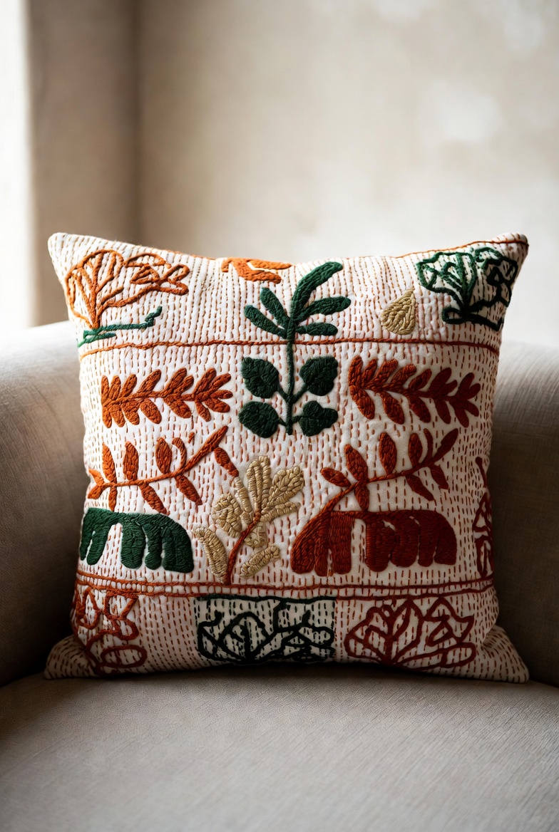 Motifs: Flowing vines, leaves, and folk storytelling patterns