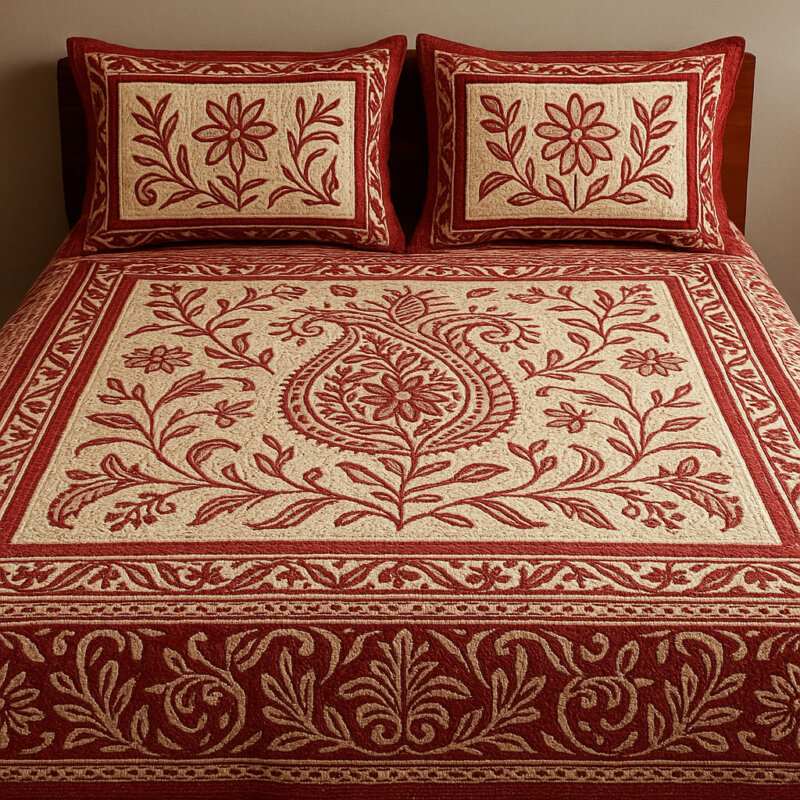 Handwoven indigo Nakshi Kantha bed sheet set with two matching pillow covers. Soft long-staple cotton, subtle storytelling stitches, numbered small batch for collectors of quiet luxury.