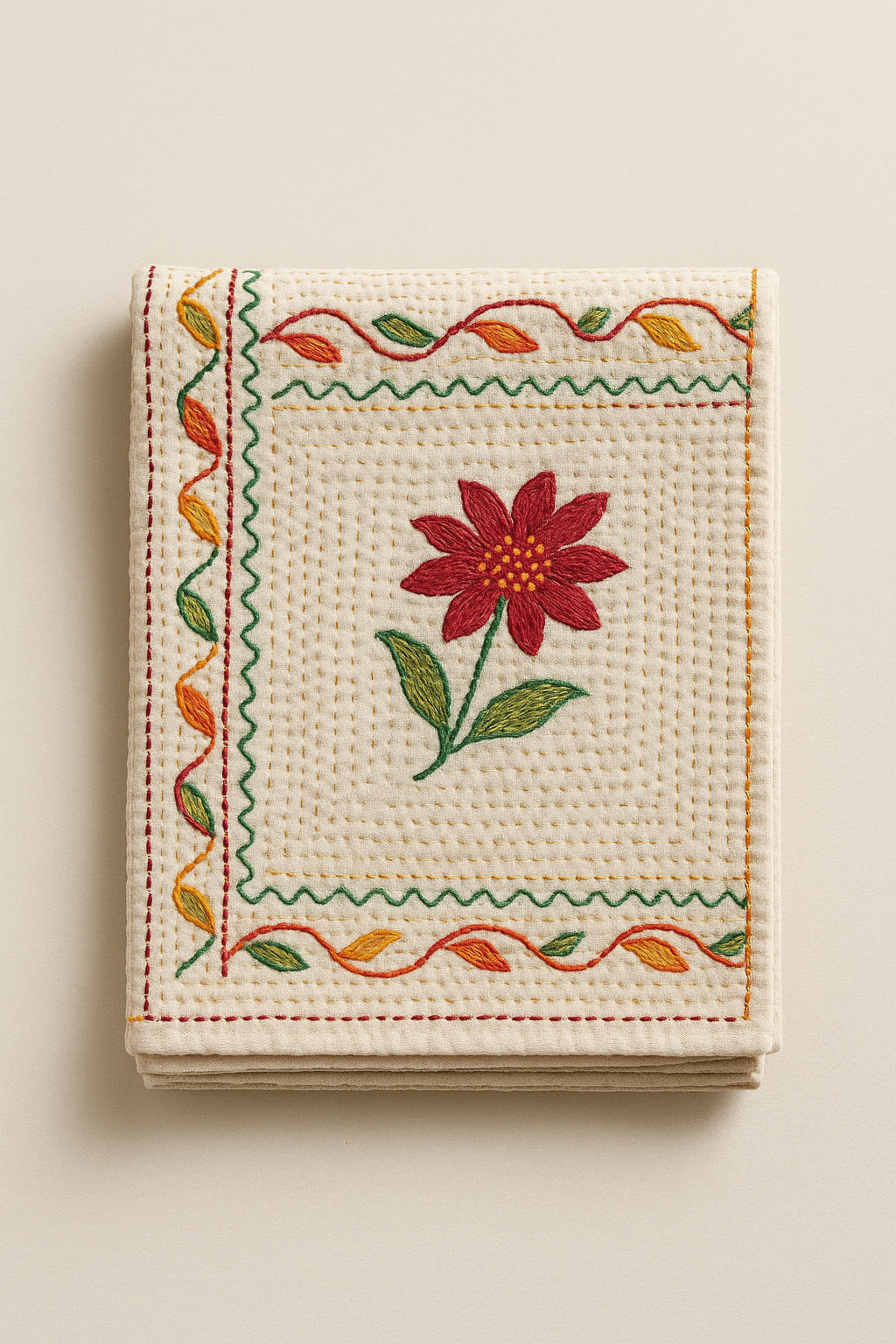 Cold gentle machine wash (inside out), mild detergent, no bleach. Line dry in shade. Warm iron on reverse if needed. Do not tumble dry on high heat. Kantha stitches will soften beautifully over time.